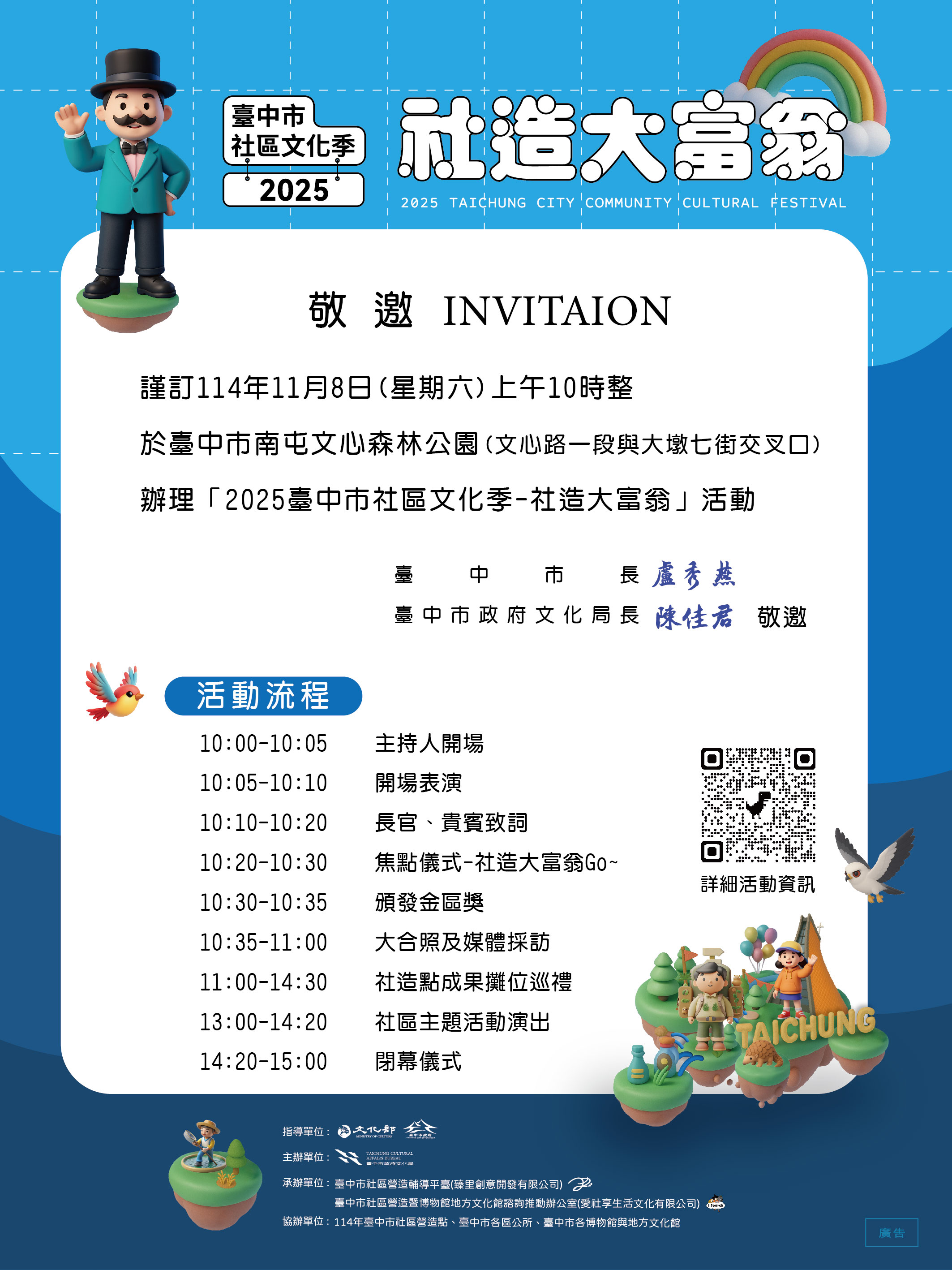 一、 為展現臺中市社區營造成果,串聯114年度社造點、各區公所、社區大學等,共同呈現社區的主題特色,本(114)年11月8日(星期六)上午10時至15時於文心森林公園南側溜冰場(文心路一段與大墩七街交叉口)辦理社區文化季活動,歡迎踴躍參加。