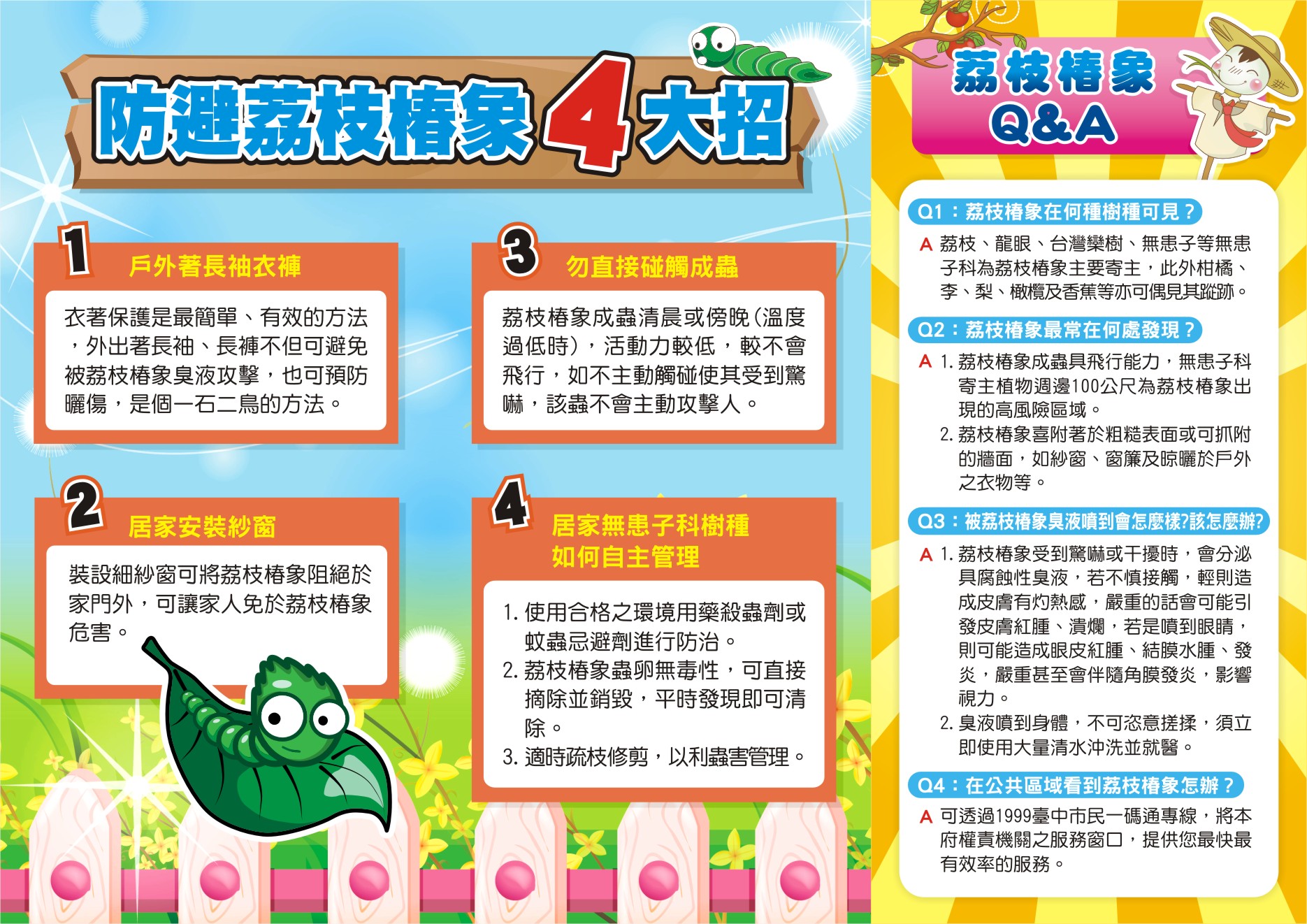 有關農業部動植物防疫檢疫署訂定115年中彰投雲區域荔枝椿象化學共同防治期程,針對荔枝及龍眼作物,自115年2月9日起至3月20日實施,周知種植荔枝、龍眼農友依時使用核准用藥進行防治工作,並於開花前10日停止施藥,同時轉知蜂農參考,避免蜂群中毒事件發生。