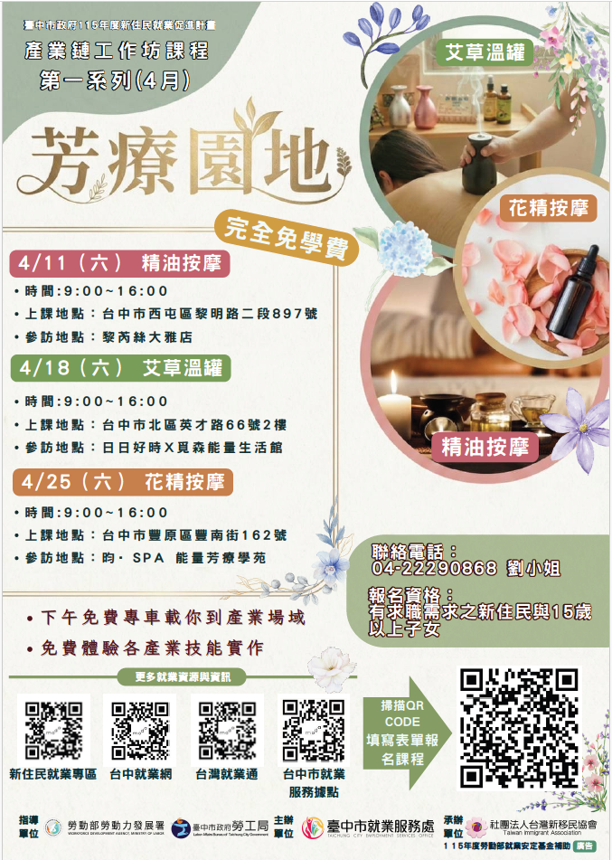 臺中市就業服務處委託社團法人台灣新移民協會辦理「芳療園地」產業鏈工作坊鼓勵待業新住民踴躍報名參與
