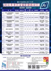一、 本局每年規劃辦理短期職業訓練暨技能認證訓練,為提升民眾職場能力,拓展第二專長技能,增強職場競爭力,設計辦理短期、單元性、重點式、易懂實作的課程及輔導民眾技能認證的實力。