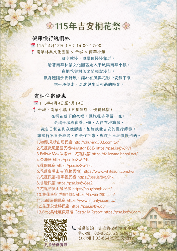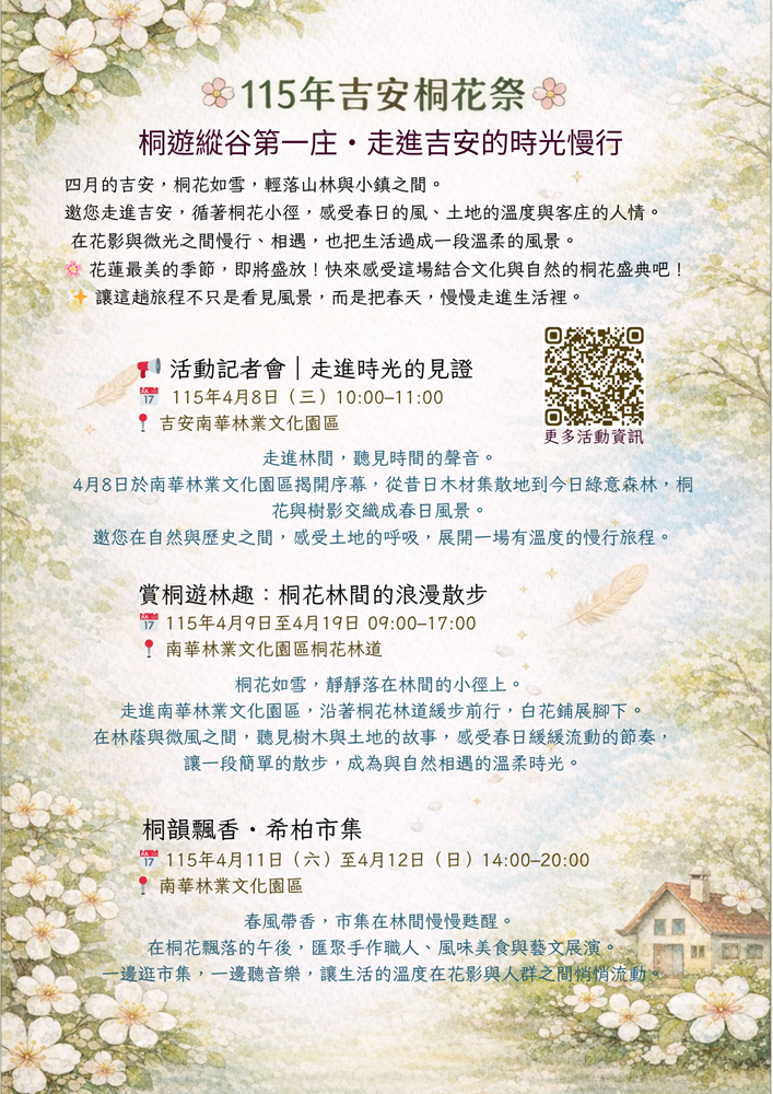 一、為推廣本鄉客家文化藝術與自然景觀之美,本所規劃辦理 「2026吉安桐花祭」系列活動。本次活動特別結合南華林 業文化園區之歷史底蘊,透過慢行體驗、藝文市集與在地 住宿優惠,引領民眾走進自然,感受土地與人文交織的時 光慢行。 二、活動資訊如下: (一)活動期間: 115年4月9日(星期四)至4月19日(星期 日)。 (二)活動地點: 南華林業文化園區及周邊慢行路徑。 (三)四大主題活動: 1、賞桐遊林趣: 漫步園區桐花林道,體驗落花如雪的然美景。 2、桐韻飄香・希柏市集: 匯聚手作職人、在地風味美食 與精彩藝文演出。 3、健康慢行遶桐林: 4月12日辦理,走入干城與南華小 鎮,感受鄉間靜謐時光。 4、賞桐住宿優惠: 串聯在地優質旅宿及五星級飯店,提 供專屬折扣及「吉安限定入住禮」。 三、活動網頁(https://www.ji-an.gov.tw/hakka /events/R2V8t3CZzeGy)查 詢。 四、海報4張。 |
