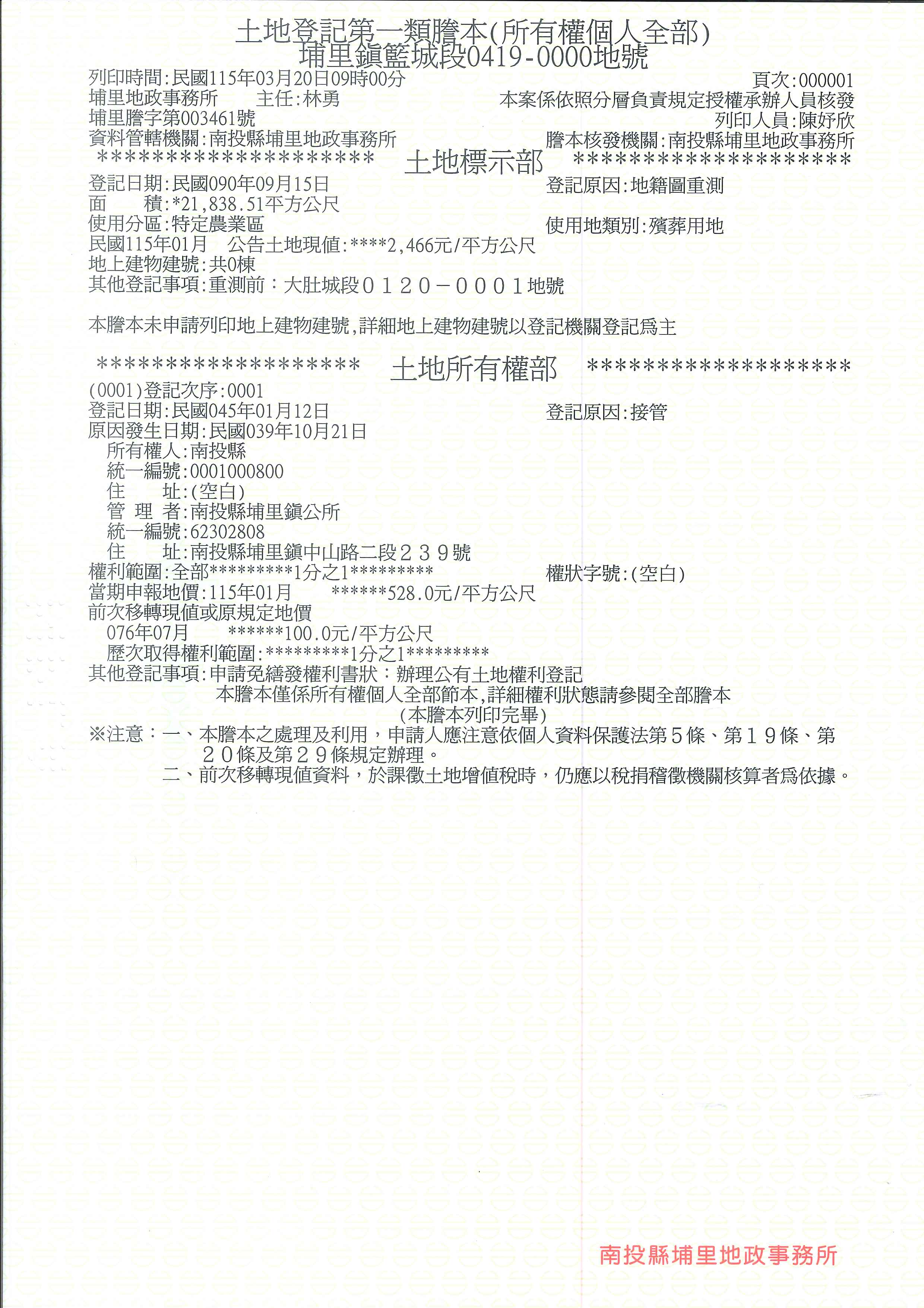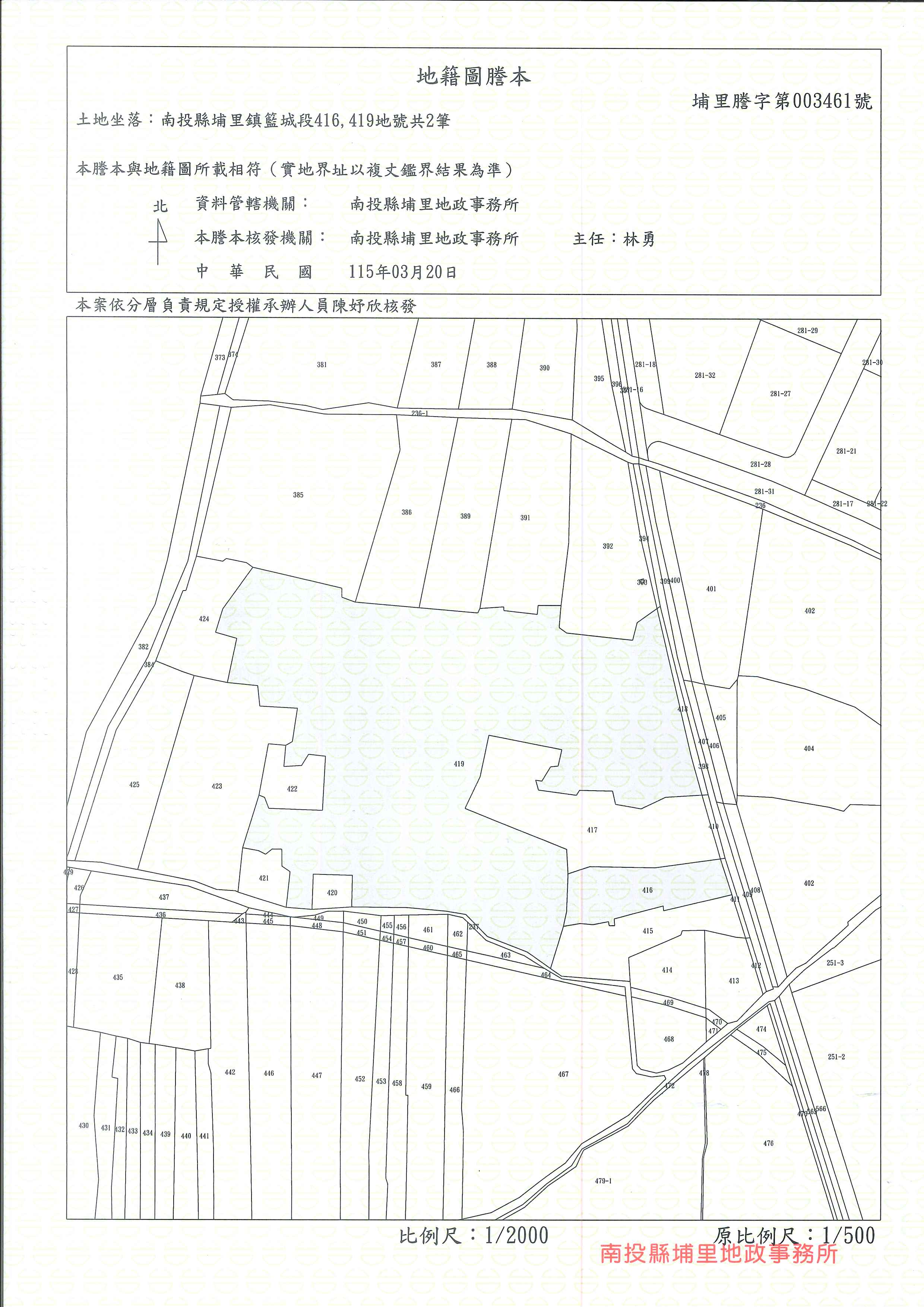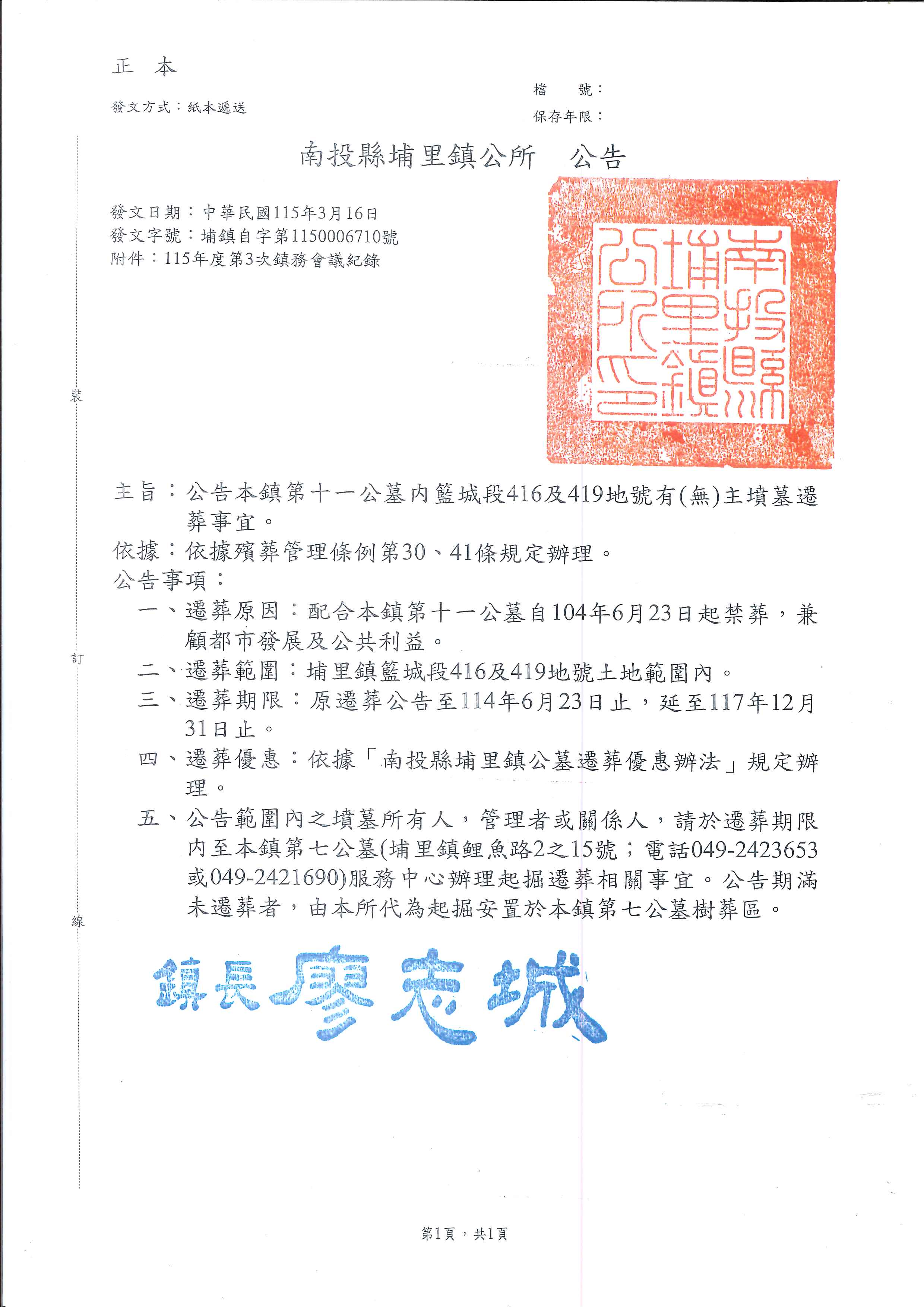 南投縣埔里鎮公所檢送埔里鎮第十一公墓內籃城段416及419地號有(無)主墳墓遷葬公告及地籍資料