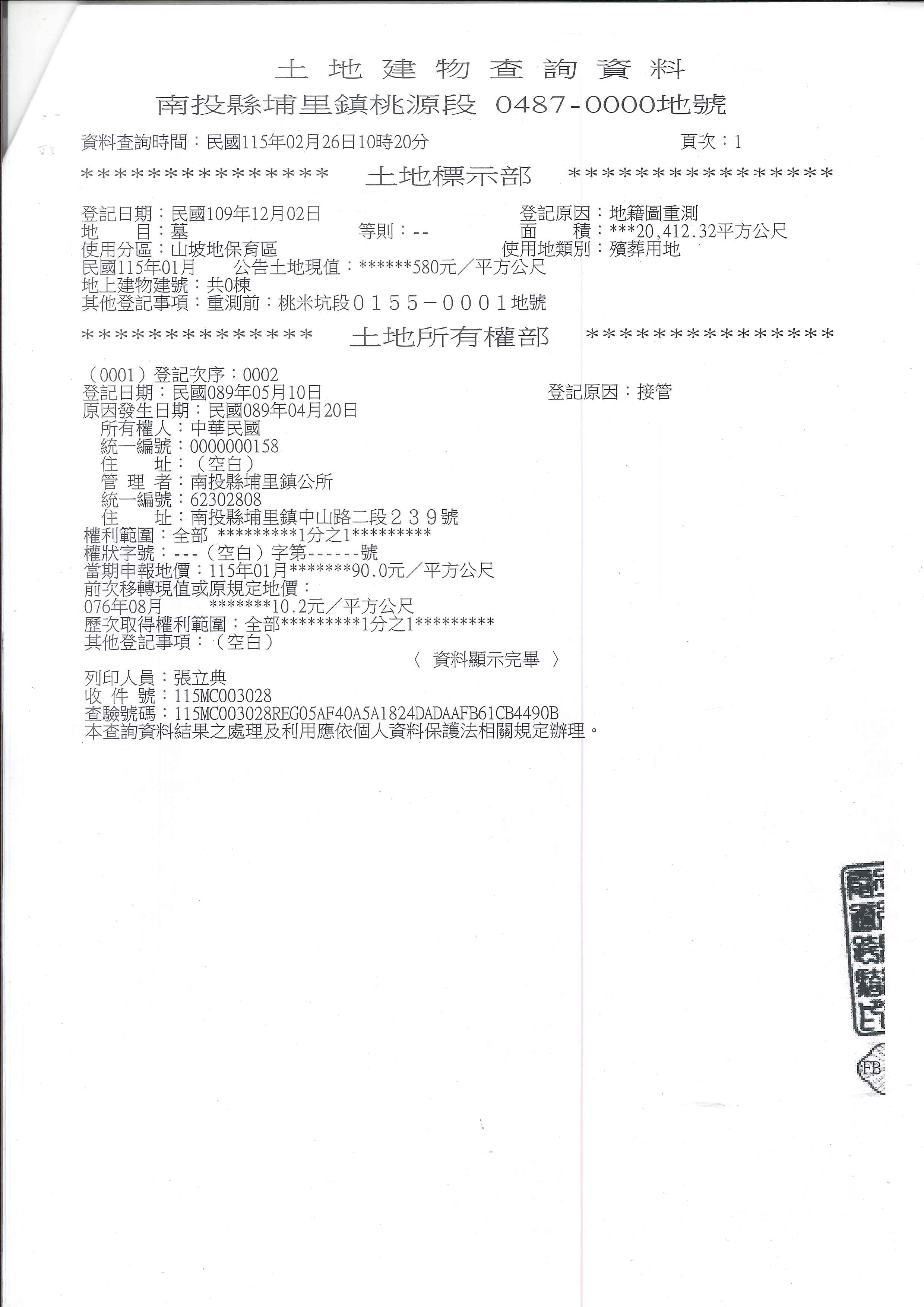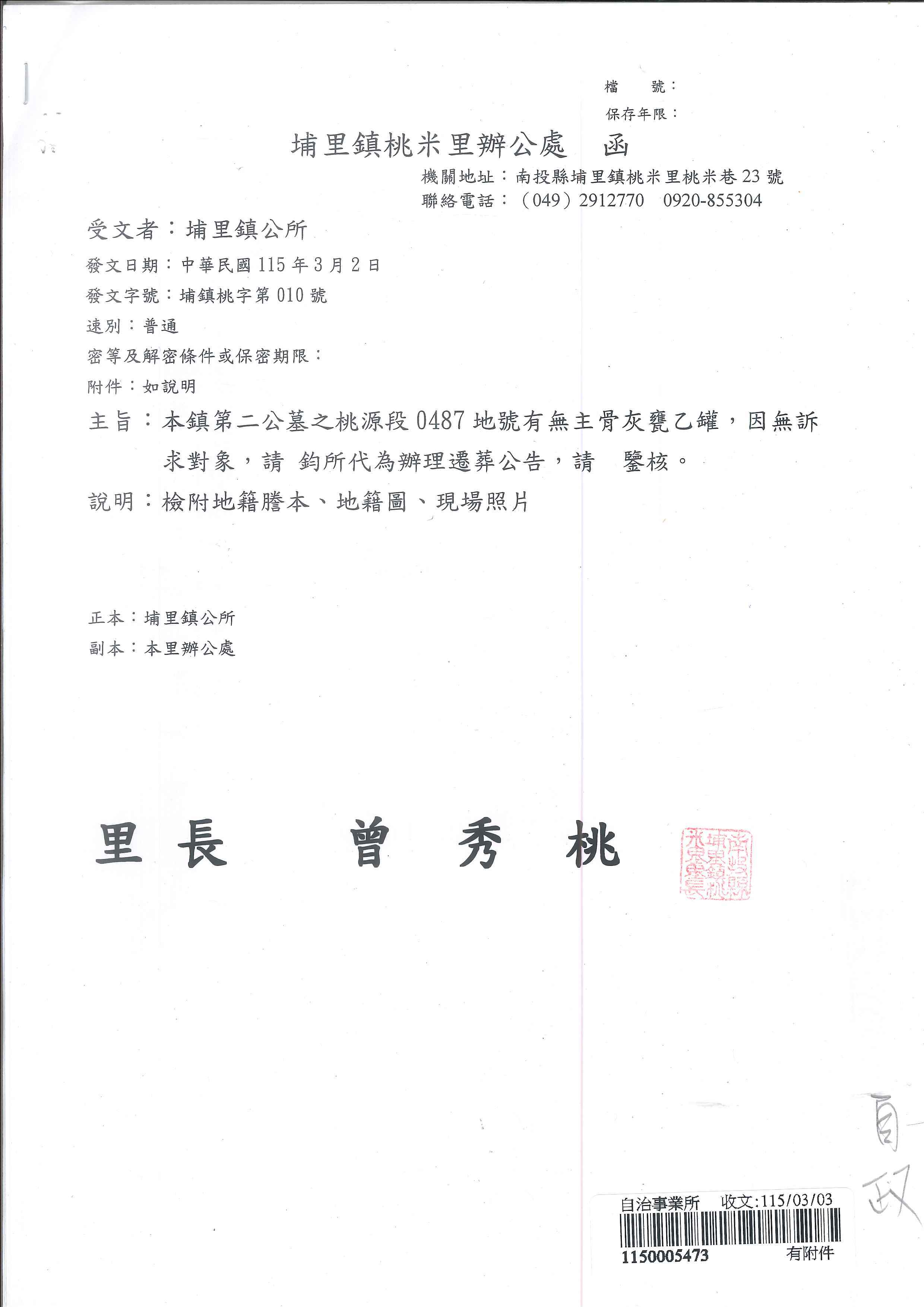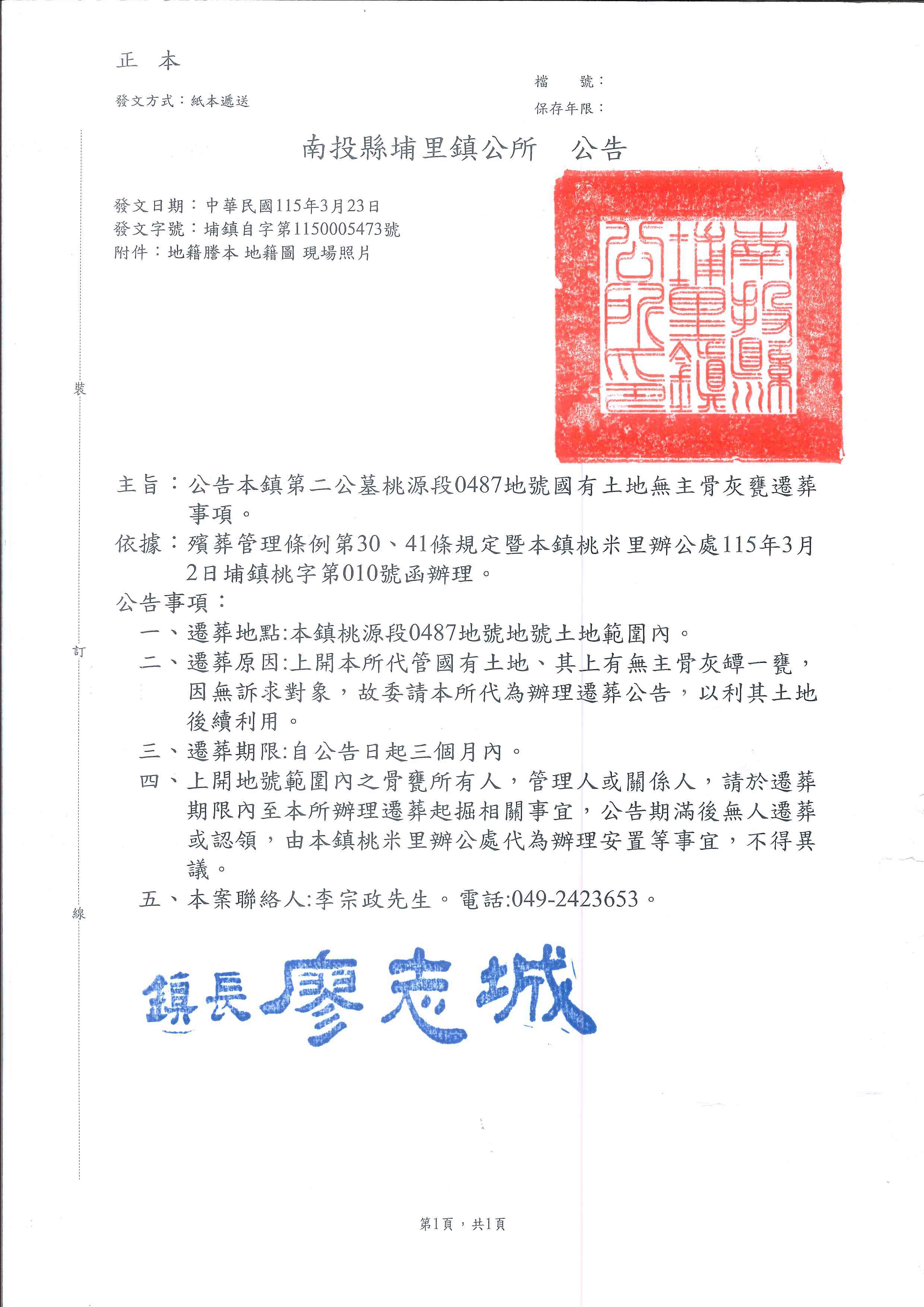 南投縣埔里鎮公所檢送埔里鎮桃源段0487地號國有土地無主骨灰甕遷葬公告