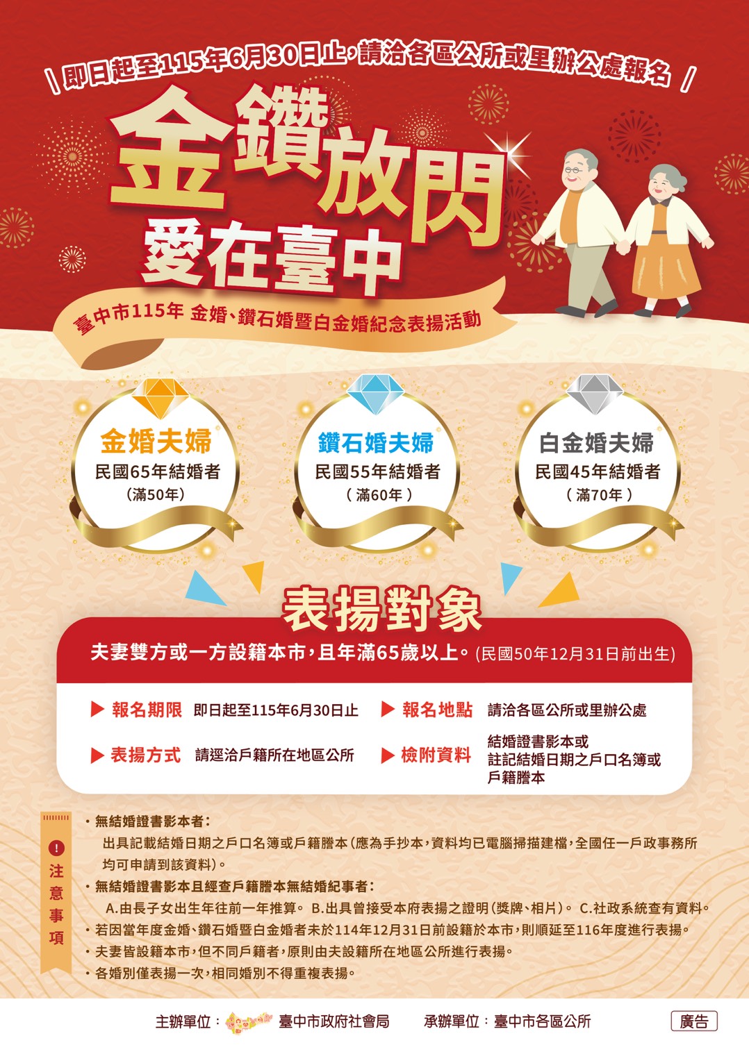 115金鑽婚海報 🎉🎎115年👑金婚、💍鑽石婚暨白金婚紀念表揚🏆活動,自即日起至115年6月30日止受理報名,歡迎符合資格者向【各里辦公處】或【戶籍所在地區公所】報名。 ✅✅請檢附結婚證書影本或註記結婚日期之戶口名簿✅✅ 👑金 婚:設籍本市結婚滿五十年之夫婦(民國65年結婚者)。 💍鑽石婚:設籍本市結婚滿六十年之夫婦(民國55年結婚者)。 🪙白金婚:設籍本市結婚滿七十年之夫婦(民國45年結婚者)。 且114年底前設籍本市。 📣📣各婚別僅表揚一次,相同婚別不得重複表揚。