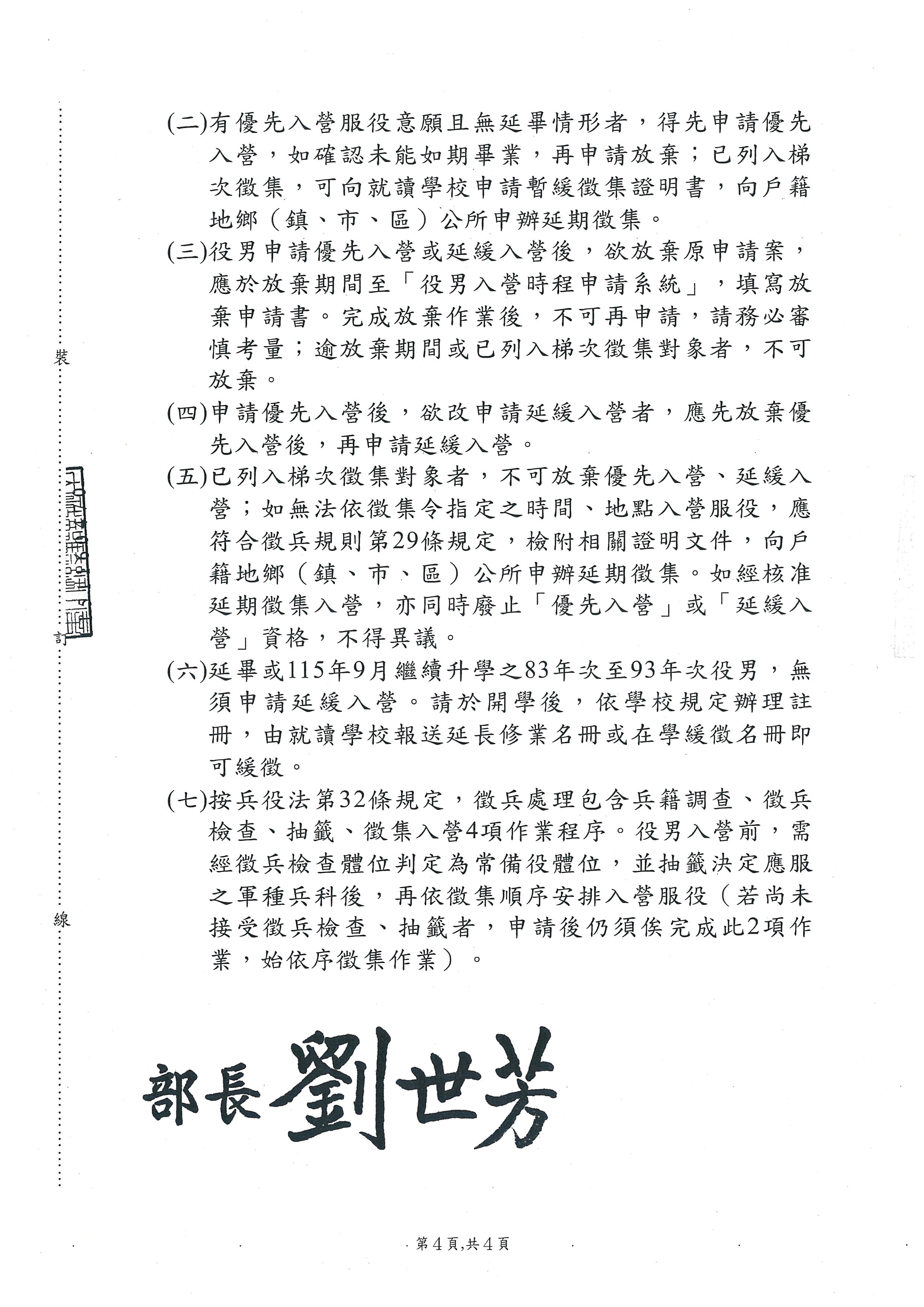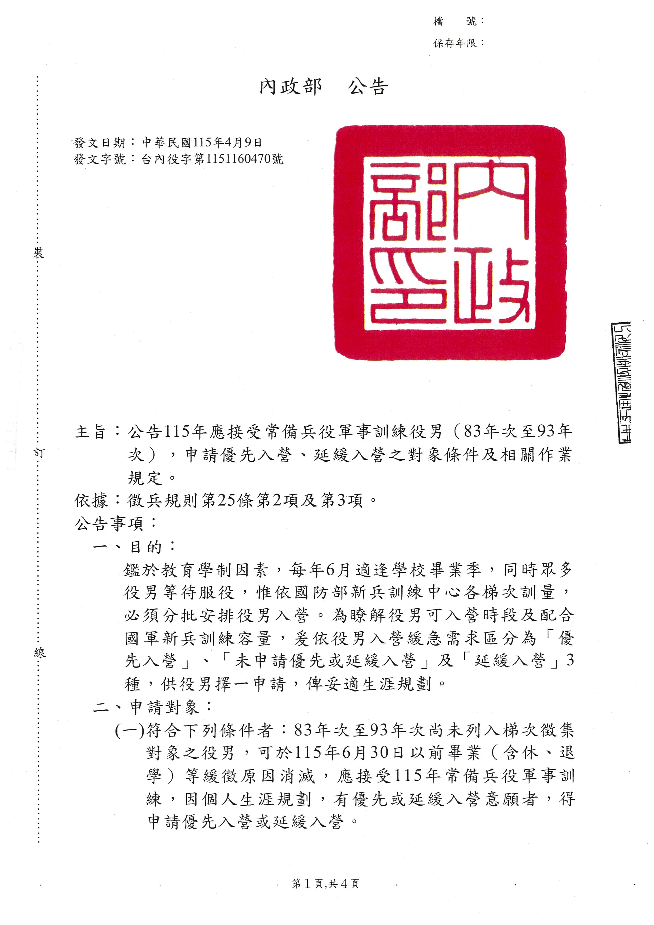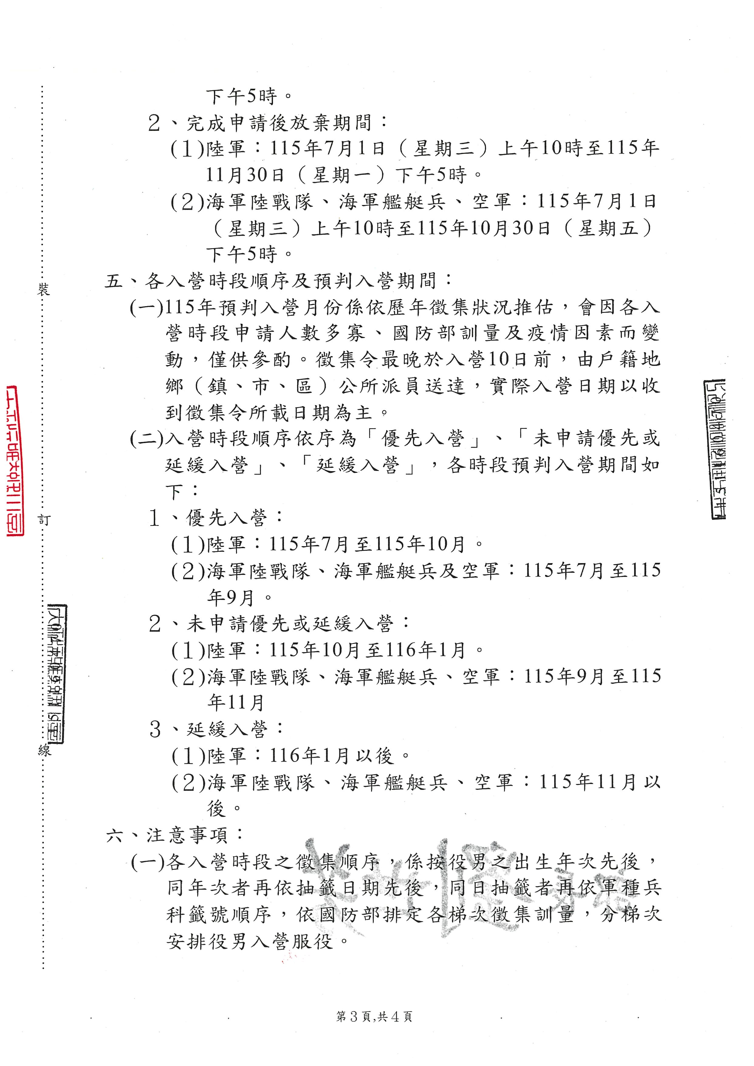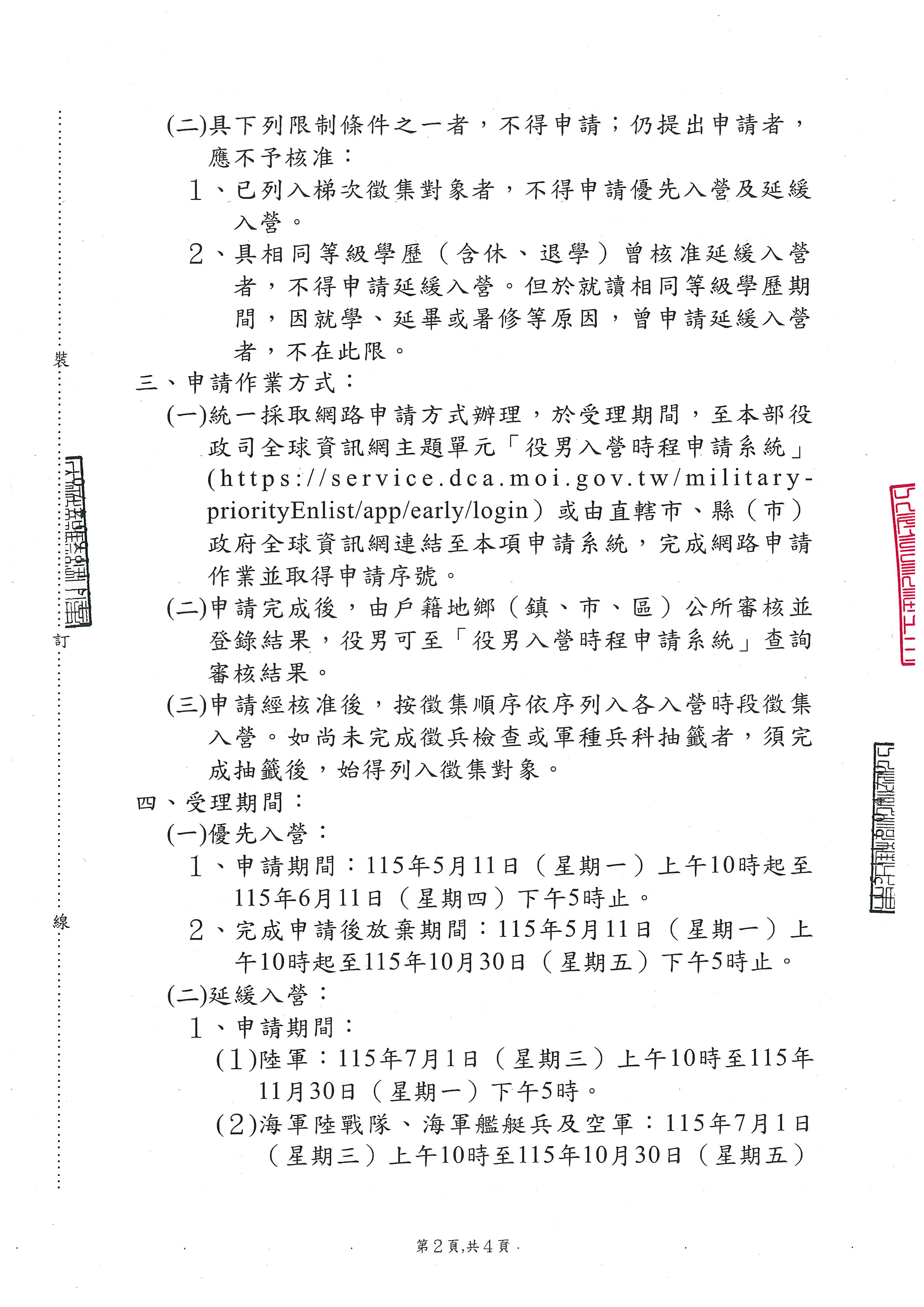 2. 延緩入營:115年7月1日(星期三)上午10時起至115年11月30日(星期一)下午5時止。